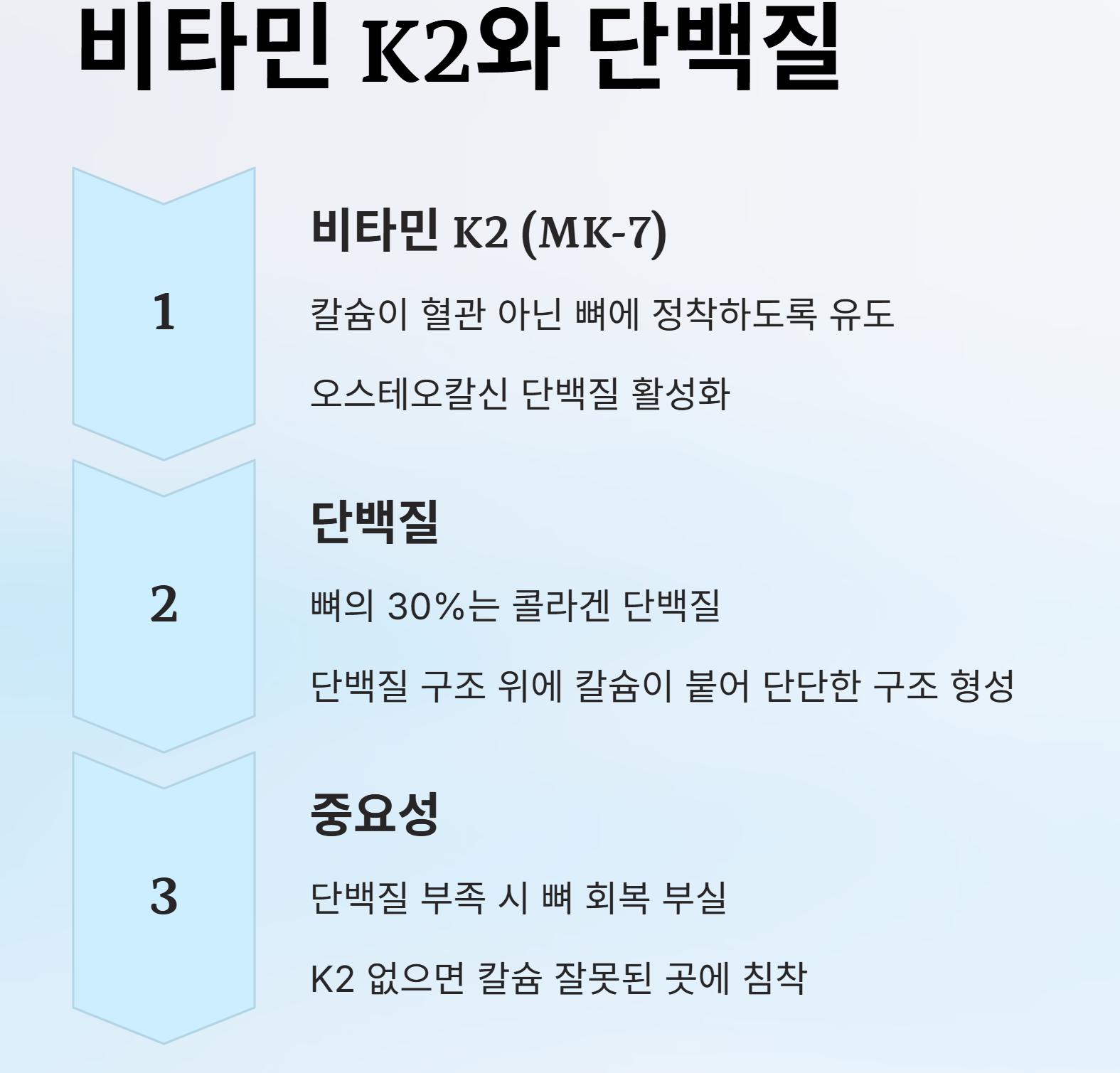 - 비타민 K2: 칼슘이 혈관이 아닌 뼈에 가도록 유도