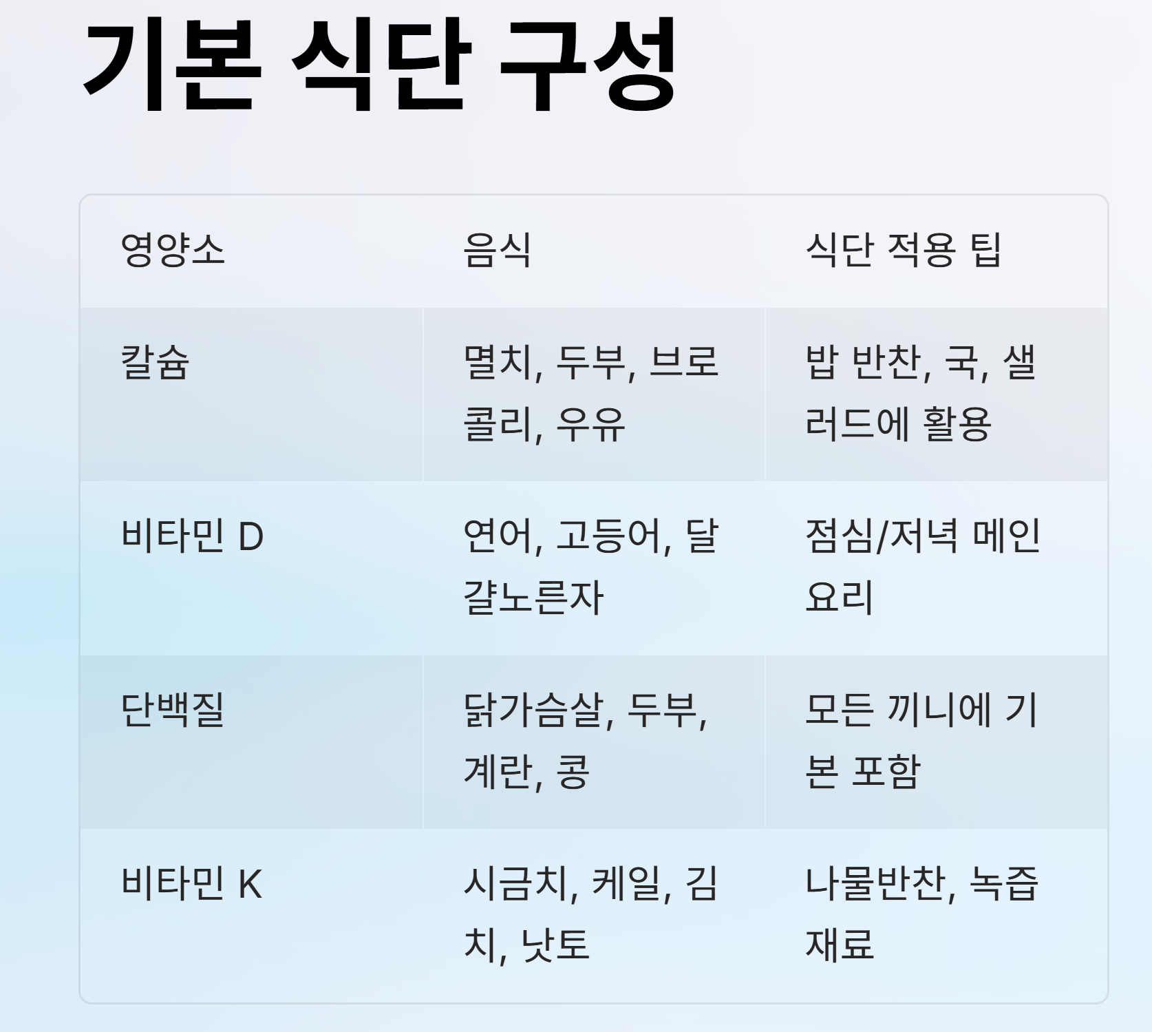 | 칼슘 | 멸치, 두부, 브로콜리, 우유 | 밥 반찬, 국, 샐러드에 활용 |