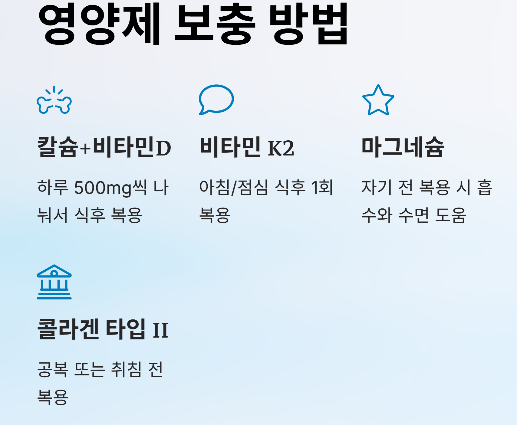 | 칼슘 + 비타민 D 복합제 | 하루 500mg씩 나눠서 식후에 복용 |